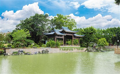 脚下是保留原始面貌的石板路,适合岭南潮湿多雨的气候特点——雨天不打滑,潮湿不长苔。雕塑广场上,梅花林曲径通幽,天然石与卵石铺就了海绵湿地。