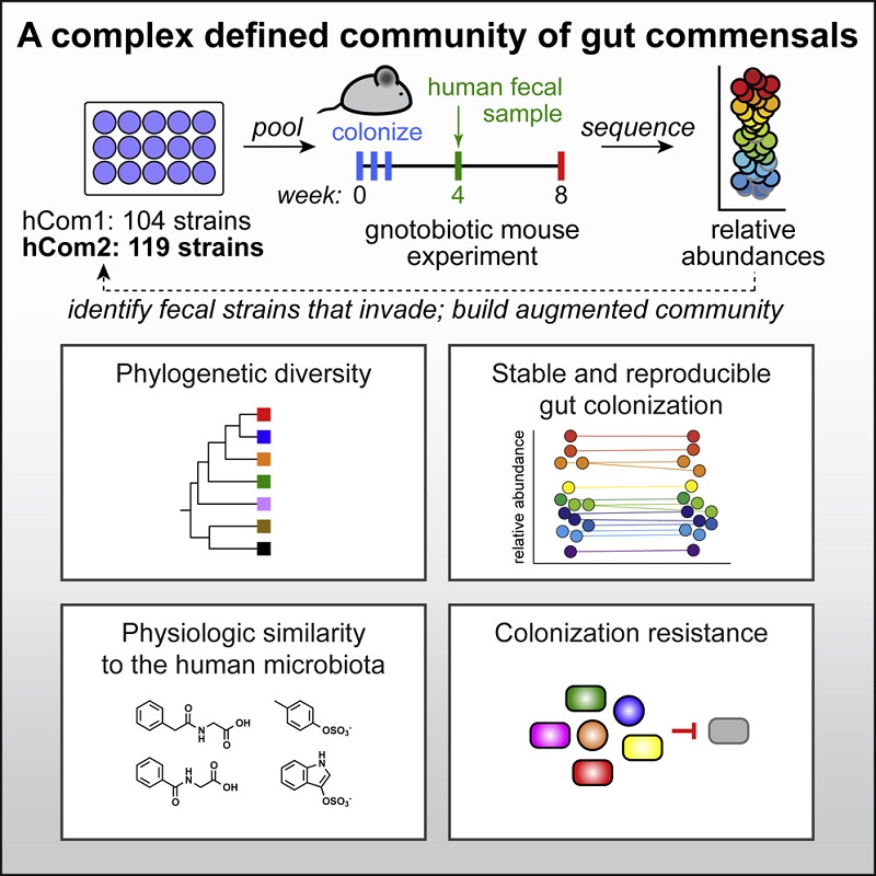 最新研究利用了人类微生物组项目(HMP)的相关成果,HMP旨在对300多名成年人的完整微生物基因组进行测序。研究人员选择了在至少20%的HMP个体体内存在的100多种细菌菌株,随后添加了一些后续研究所需菌种,使菌种数量达到104种。他们让这些细菌单独生长,然后混合到培养物中,形成人类菌种1(hCom1)。他们将hCom1引入精心培养的体内不存在细菌的小鼠体内,发现hCom1非常稳定,98%的细菌在无菌小鼠的肠道中“落地生根”,每种细菌的相对丰度在两个月内保持不变。为使菌种群体更完整,他们又发现了20多种新细菌,将其添加到hCom1中,并移除那些未能在小鼠肠道内扎根的细菌,形成了由119个菌株组成的新群落hCom2。