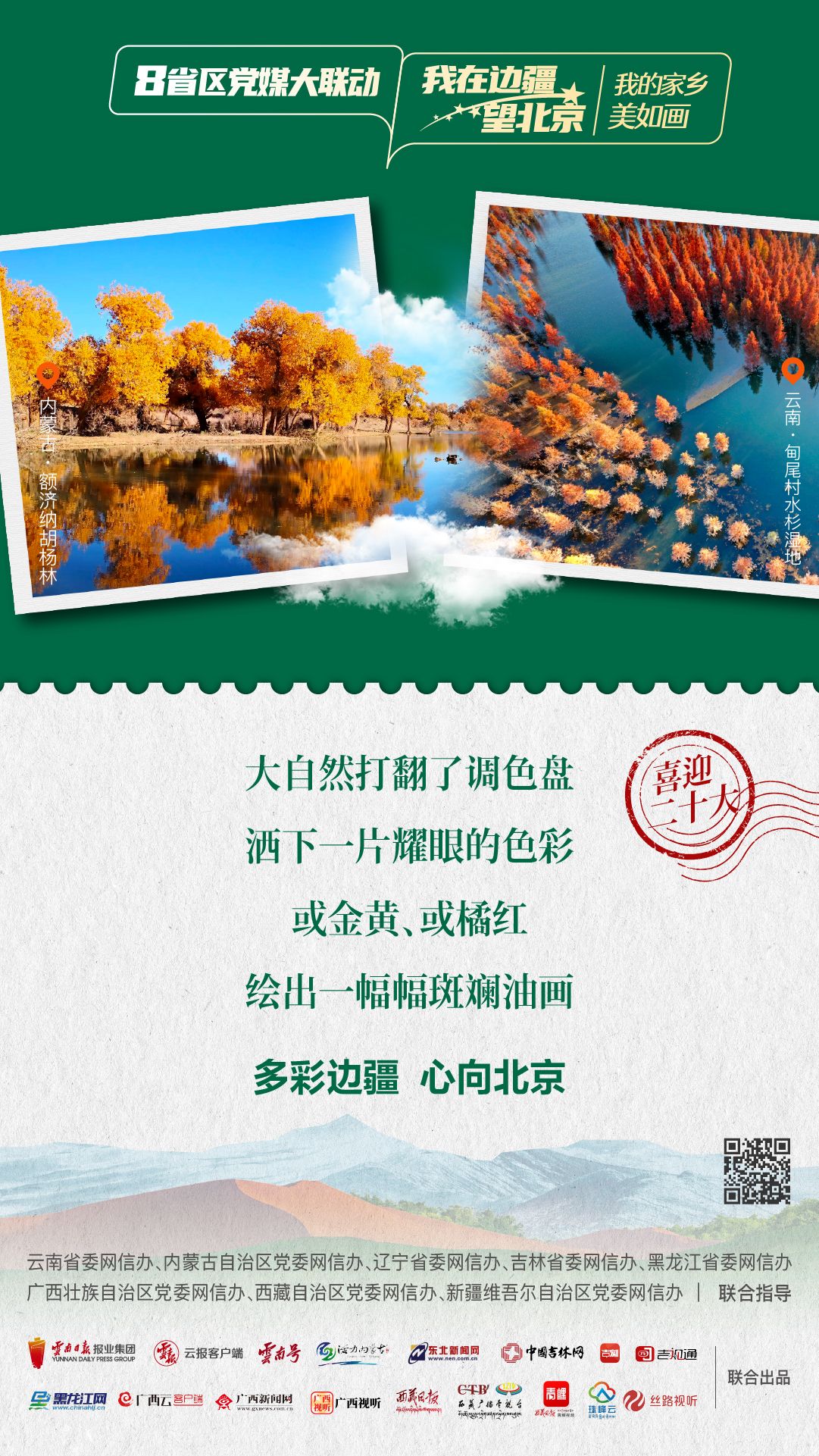 为生动讲述在党的引领下边疆地区发生的翻天覆地的变化,边疆人民用勤劳双手和智慧改变家园、改变命运的新故事,深刻描绘边疆干部群众以实际行动向党的二十大献礼,深情告白“喜迎二十大 奋进新征程”的喜悦之情。由云南省委网信办指导,云南省媒体融合重点实验室——融媒体精品制作室制作,云南日报报业集团云报客户端联动内蒙古自治区、辽宁省、吉林省、黑龙江省、广西壮族自治区、西藏自治区、新疆维吾尔自治区,联合推出融媒体联动产品《8省区党媒大联动·我在边疆望北京》。今天一起来看第一期:“我的家乡美如画”。