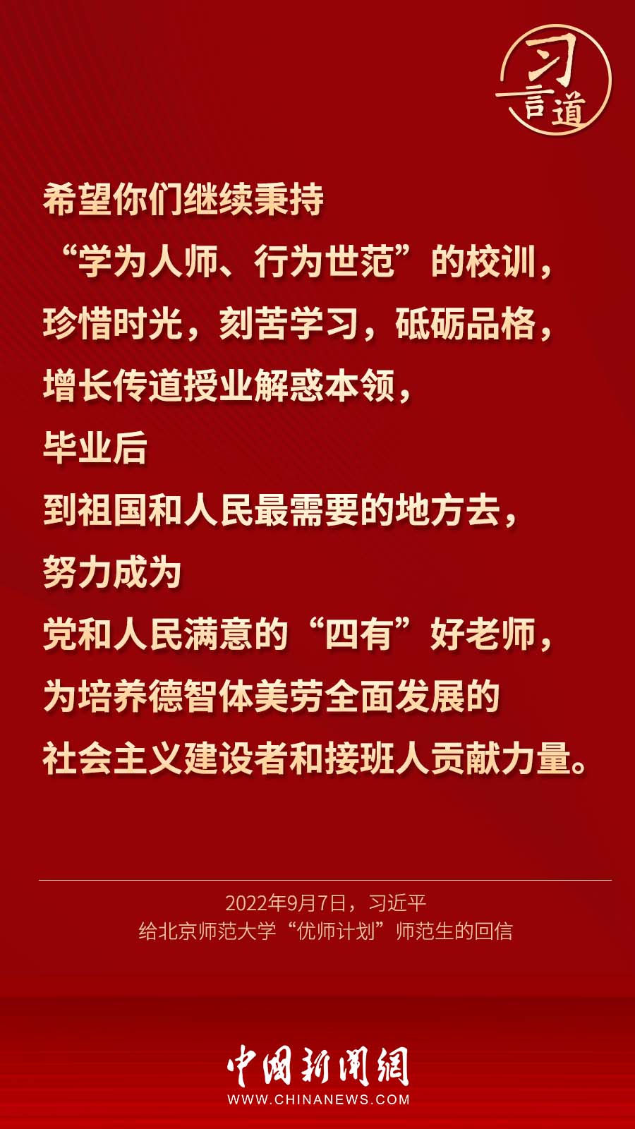 9月7日,习近平总书记回信勉励北京师范大学“优师计划”师范生,努力成为党和人民满意的“四有”好老师。十八大以来,习近平多次通过书信的形式,对教师群体寄予殷切期望。