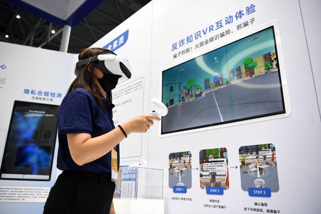 9月4日,一家参展企业代表在2022年国家网络安全宣传周网络安全博览会上演示反诈知识VR互动体验项目。新华社记者 刘军喜 摄