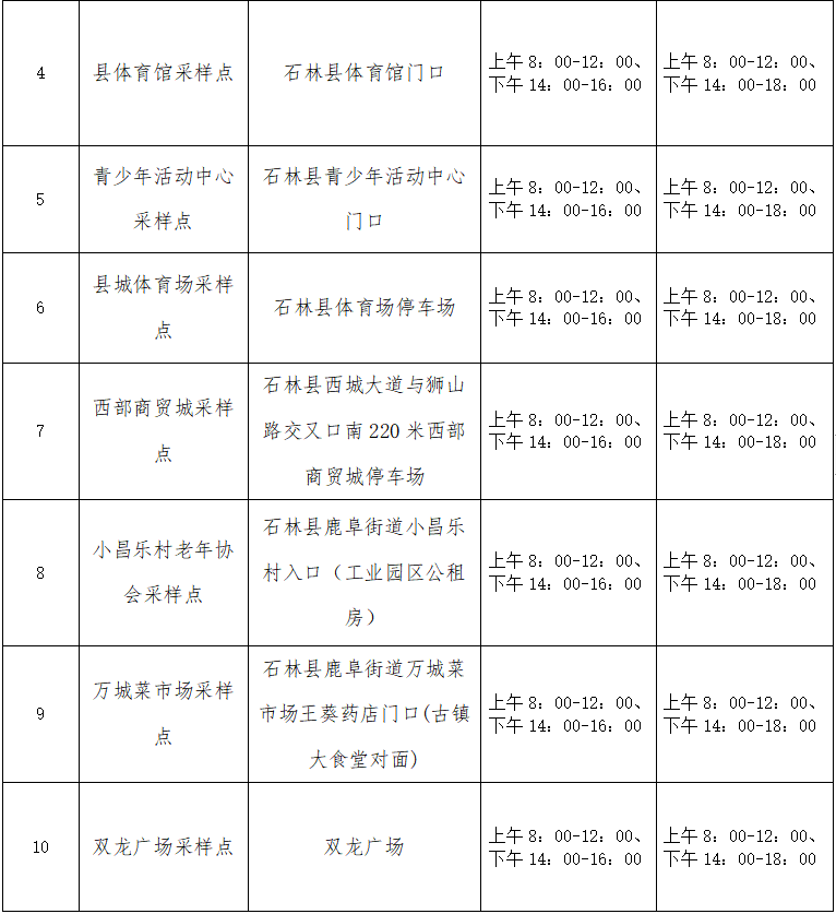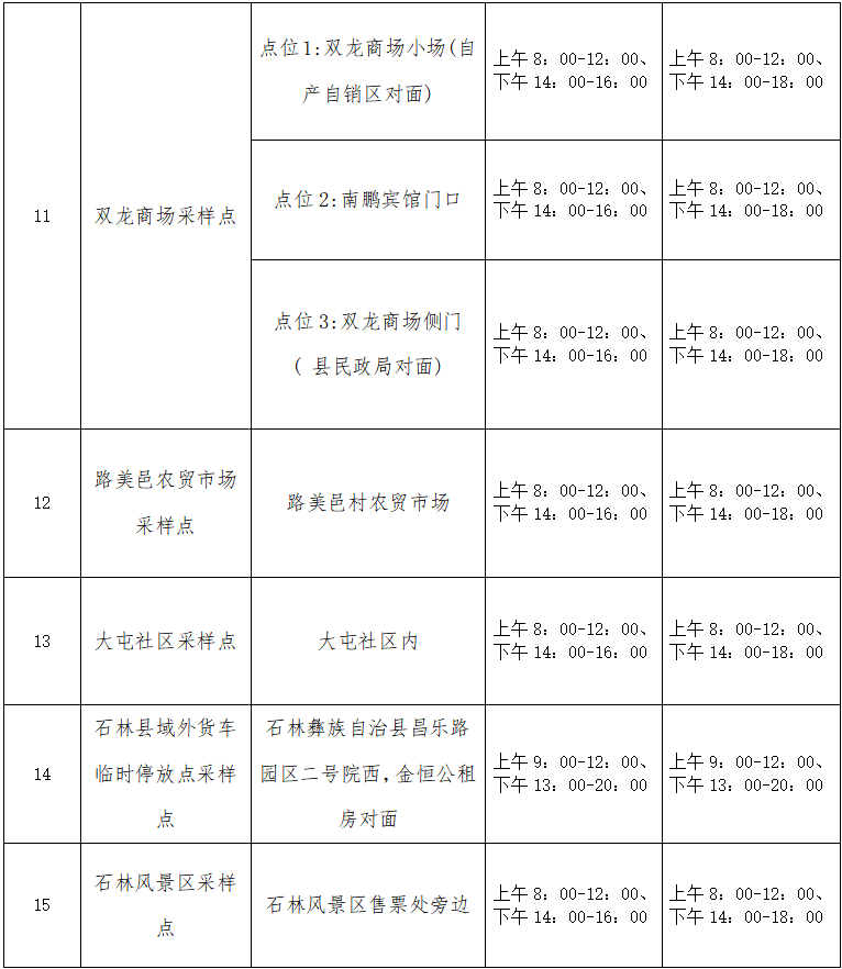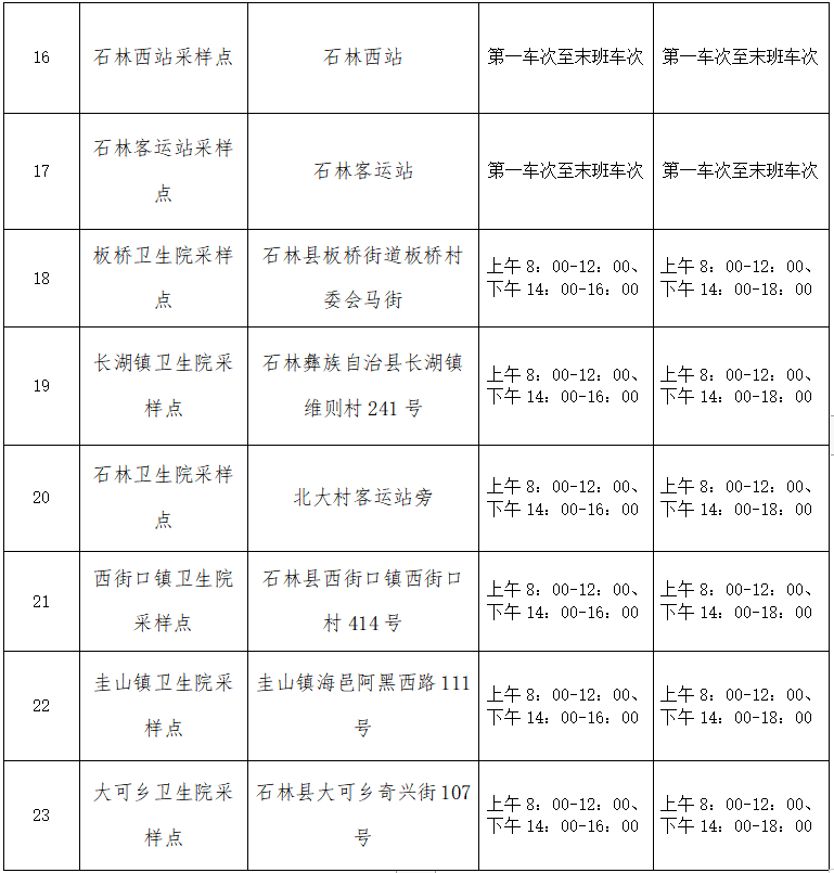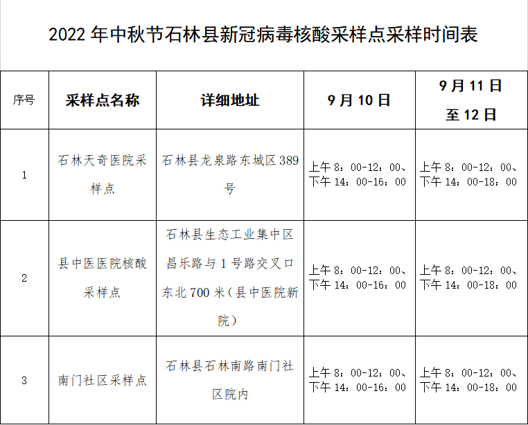 为做好节日期间核酸采样工作,中秋节期间石林县核酸采样点均正常开展采样工作,现将采样时间公布如下: