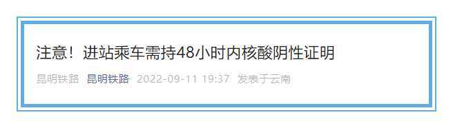 9月11日,昆明铁路发布最新提示,按照国务院联防联控机制规定,2022年9月10日至10月31日,旅客进站乘车需持48小时内核酸阴性证明。详情如下: