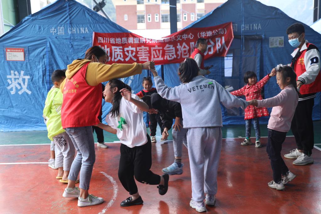 9日,在安置点“青青儿童乐园”里,志愿者老师正陪孩子们做游戏。新华社记者 刘琼 摄