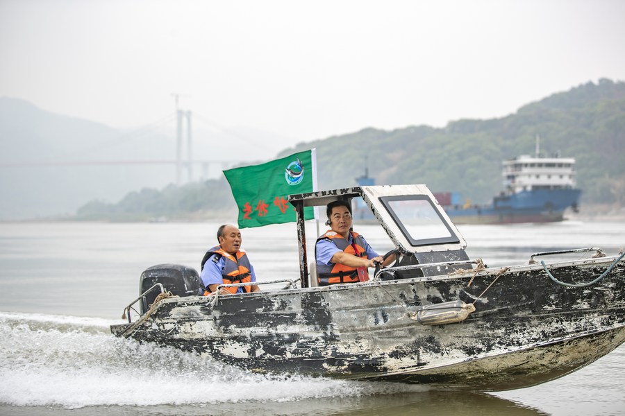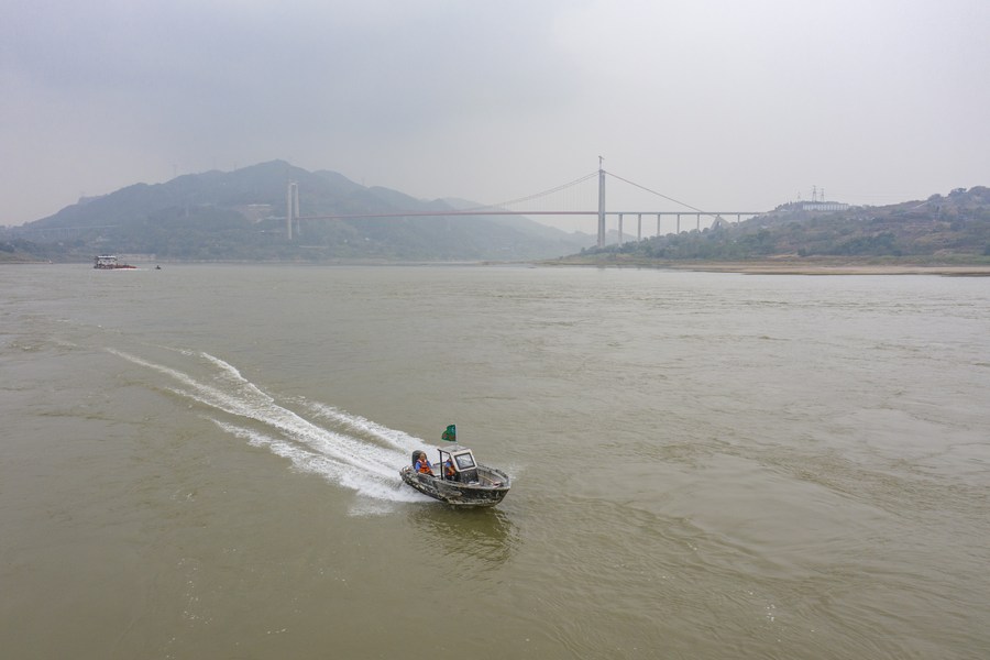 在长江重庆江津段,重庆市江津区鸿鹄护渔志愿队队员在长江上游珍稀特有鱼类国家级自然保护区巡护。新华社记者 黄伟 摄