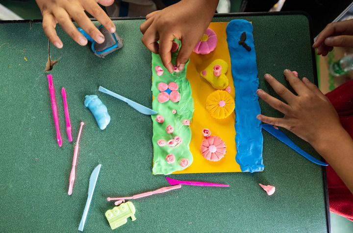 9月10日,在泸定二中临时安置点的“帐篷课堂”里,孩子们用橡皮泥制作创意“月饼”。新华社记者 沈伯韩 摄