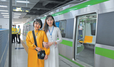 中企承建的越南首条城市轻轨投入运行。图为两名乘客在轻轨列车前留影。