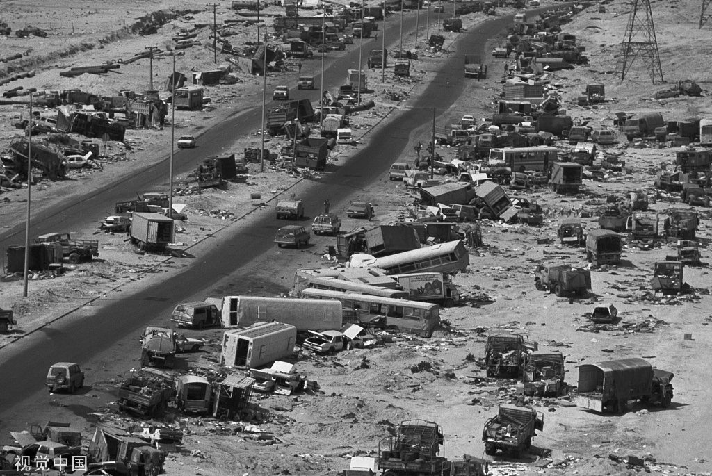 1991年2月26日,根据联合国决议,伊拉克军队从科威特撤退。然而,当他们的车队在80号公路上行进,美军却突然出手:集束炸弹、500磅炸弹、燃烧弹如雨点般落下,军人与平民无差别地受到攻击。(视觉中国)