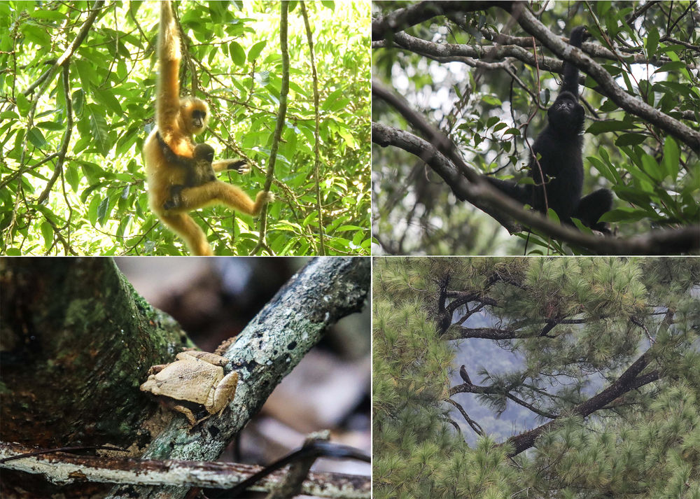 拼版照片:左上图为2021年5月拍摄的海南长臂猿B群幼猿(海南热带雨林国家公园管理局供图);右上图为在海南热带雨林国家公园体制试点区霸王岭自然保护区内拍摄的海南长臂猿(2019年10月25日新华社记者蒲晓旭摄);左下图为在霸王岭自然保护区内拍摄的姬蛙(2019年10月26日新华社记者蒲晓旭摄);右下图为在霸王岭自然保护区内拍摄的蛇雕(2019年10月26日新华社记者蒲晓旭摄)。新华社发
