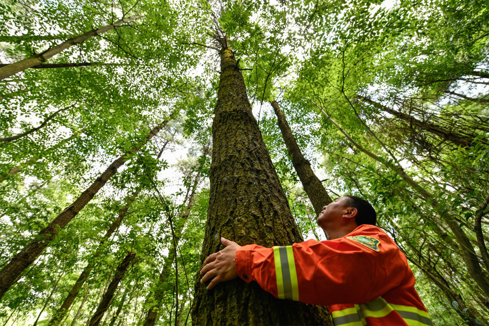 在贵州省贵阳市长坡岭国家级森林公园,村级林长郭健用手量一棵树的直径(2022年7月13日摄)。新华社记者 杨文斌 摄