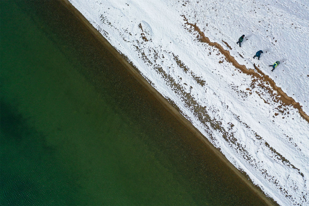 在青海省果洛藏族自治州玛多县扎陵湖乡勒那村,三江源国家公园黄河源园区生态管护员在巡护(2021年10月20日摄,无人机照片)。新华社记者 张龙 摄