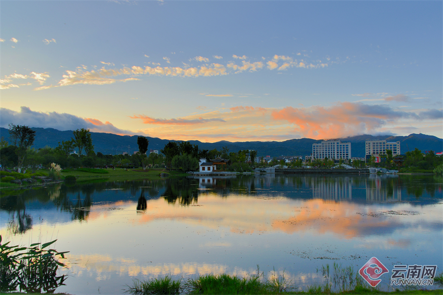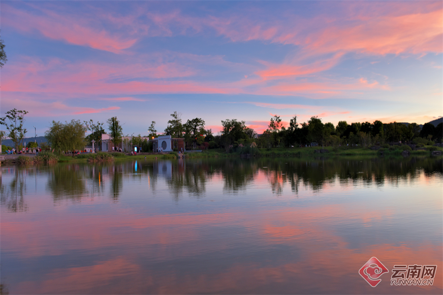 青荇的在清澈见底的星河里招摇,鱼儿欢乐地游来游去,两岸斑驳的树影和天空中翩跹的白鹭倒映在星河中,星河便自然形成了一幅打开的山水田园画卷。星河田野里,花期正盛的粉黛乱子草将昌宁的“秋”装点得更加浪漫了。晚饭后,或奔跑、或漫步于健身步道的人们都会惊艳于这一团团“粉色云雾”而竞相打卡拍照。