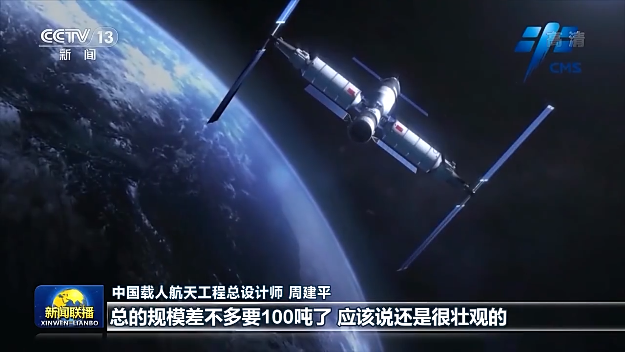 中国载人航天工程总设计师 周建平:总书记一直把航天强国建设,作为实现中华民族伟大复兴中的一个重要的组成部分。中国空间站最大构型就是三舱三船,总的规模差不多要100吨,应该说还是很壮观的。