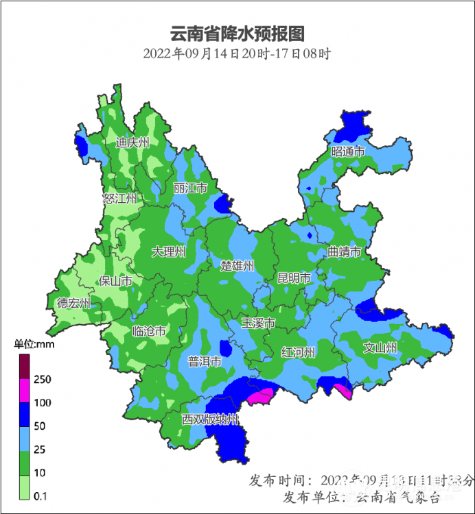 具体来看,预计9月14日夜间昭通北部有中到大雨局部暴雨;9月15日,昭通南部、曲靖北部、楚雄北部、丽江东部、红河南部、普洱东南部有中到大雨局部暴雨;9月16日,普洱东部、西双版纳、玉溪、红河有中到大雨局部暴雨。