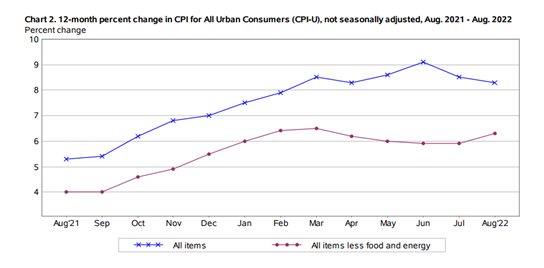 美国劳工部数据显示,尽管8月CPI同比增速(蓝线)连续两个月出现下滑,但仍连续6个月高于8%,表明通胀水平居高不下。