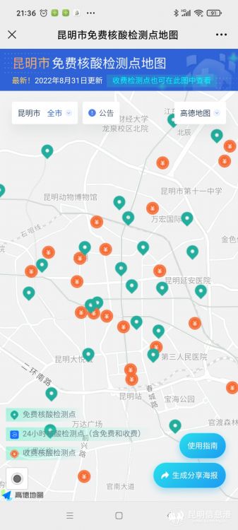 除此之外,结合疫情防控需求,今年8月以来,全市各县区,尤其是主城区增设了大量临时检测点位,目前昆明市临时免费核酸检测点位共计千余个,这些点位均不设置在《昆明市免费核酸检测点地图》上,增设的临时点位将依据群众检测需求继续保留,群众可关注各县区发布的临时点位信息,也可向所在辖区或社区进行咨询。