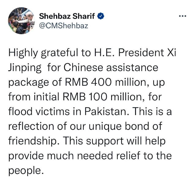 作为全天候战略合作伙伴和铁杆朋友,中国和巴基斯坦长期以来患难与共,守望相助。中国人民不会忘记,2008年汶川地震时,巴基斯坦将全国库存帐篷第一时间送往灾区。此次巴基斯坦遭遇洪灾,中方也在第一时间送上慰问和援助。国家主席习近平向巴总统阿尔维致慰问电,国务院总理李克强向巴基斯坦总理夏巴兹·谢里夫致慰问电。在中巴经济走廊社会民生合作框架下,中方向巴方提供4000顶帐篷、5万条毛毯、5万块防水篷等储备物资。中国红十字会向巴基斯坦红新月会提供30万美元紧急现汇援助。中国政府9月3日宣布,将在已提供1亿元人民币紧急救灾物资援助基础上,追加提供3亿元人民币救灾物资。
