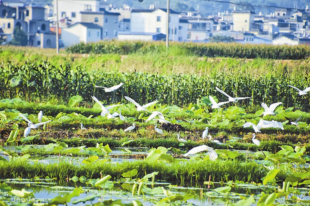 入秋以来,竹园镇1.3万多亩荷塘内,嫩绿的荷叶层层叠叠、错落有致。一阵微风吹过,成千上万只白鹭鸶、钳嘴鹳振翅而起,形成“千鸟尽舞蓝天下,万亩荷园意趣美”的动人景象。