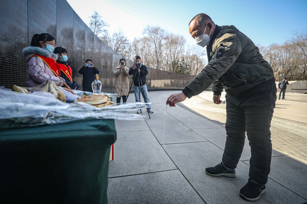 3月5日,展志忠的孙子展保成在沈阳抗美援朝烈士陵园英名墙前祭祀自己的爷爷展志忠烈士。新华社记者 潘昱龙 摄
