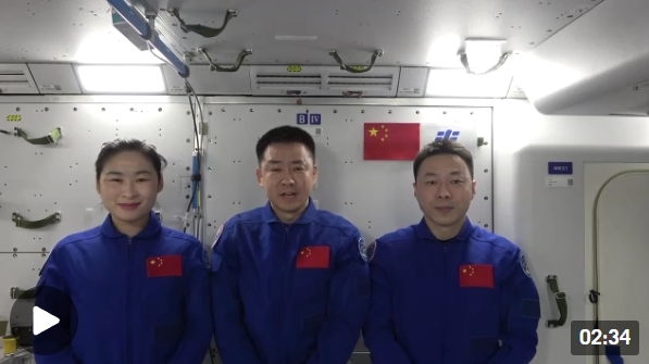 9月15日,正在中国空间站执行任务的神舟十四号载人航天飞行乘组三位航天员陈冬、刘洋、蔡旭哲通过中央广播电视总台,以视频方式向参加“共绘航天梦”绘画作品征集及“太空之问”互动活动的中外青少年发来祝福。