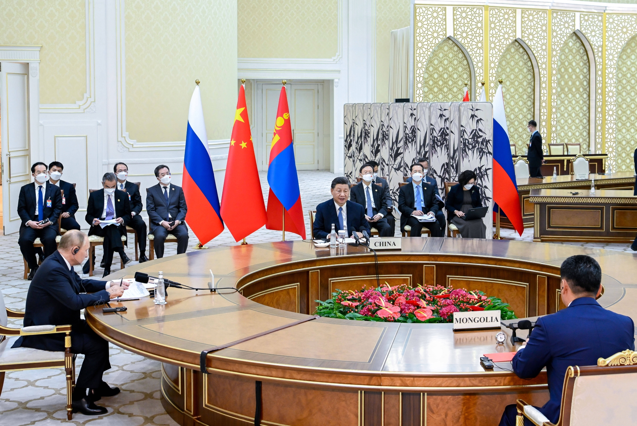 当地时间15日下午,国家主席习近平在撒马尔罕国宾馆同俄罗斯总统普京、蒙古国总统呼日勒苏赫举行中俄蒙三国元首第六次会晤。