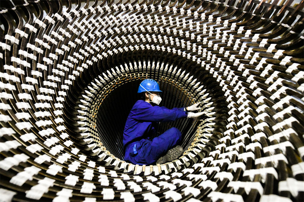 在哈电集团哈尔滨电机厂有限责任公司的生产车间,工人在进行生产作业(2022年9月3日摄)。新华社记者 王松 摄