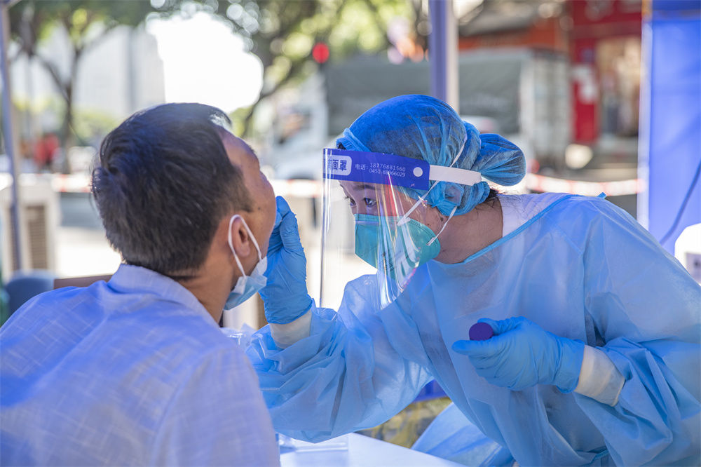 居民在重庆市两江新区人和街道邢家桥社区采样点接受核酸检测(2022年8月24日摄)。新华社记者 黄伟 摄