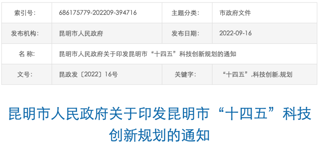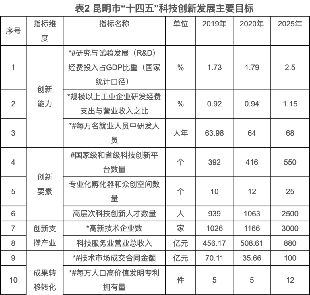 9月16日,市政府官网发布《昆明市“十四五”科技创新规划》,全面总结“十三五”科技创新工作取得的成效,明确“十四五”期间的主要任务。到2025年,昆明市将基本建成具有较强影响力的区域性国际科技创新中心,R&D经费投入占GDP比重达2.5%。