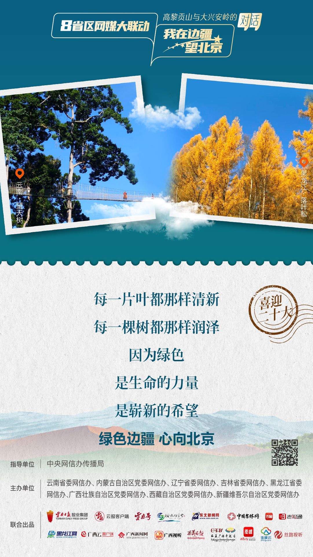 为生动讲述在党的引领下边疆地区发生的翻天覆地的变化,边疆人民用勤劳双手和智慧改变家园、改变命运的新故事,深刻描绘边疆干部群众以实际行动向党的二十大献礼,深情告白“喜迎二十大 奋进新征程”喜悦之情。在中央网信办传播局指导下,云南、内蒙古、辽宁、吉林、黑龙江、广西、西藏、新疆8省区党委网信办联合主办,云报客户端策划并联动8个沿边省区主流媒体,联合推出融媒体联动产品《8省区网媒大联动·我在边疆望北京》。今天一起来看第三期:“高黎贡山与大兴安岭的对话”。