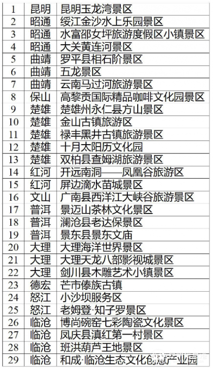 此次拟确定的景区分布于昆明、昭通、曲靖、保山、楚雄、红河、文山、普洱、大理、德宏、怒江、临沧等12个州市,分别为: