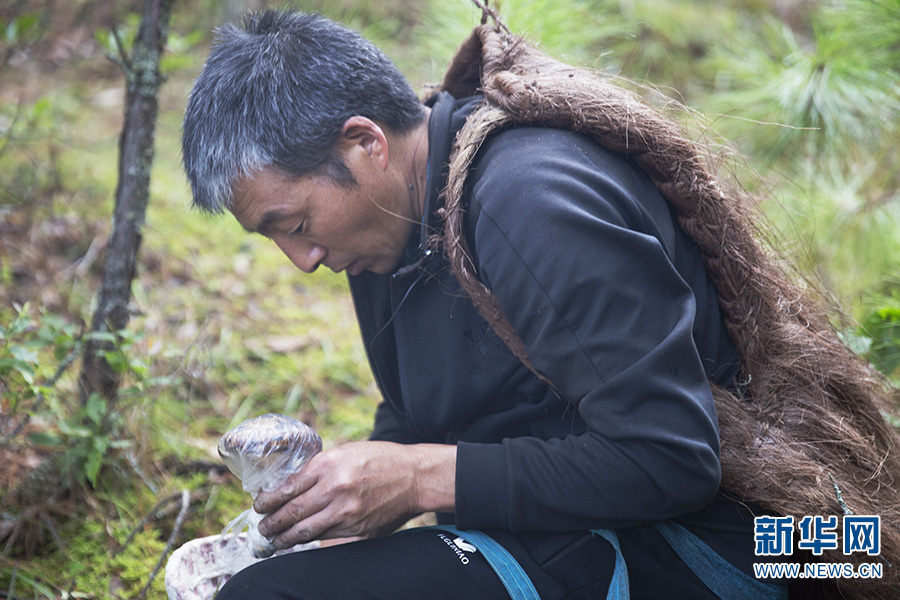 胡士平把菌子包裹好(摄于8月3日)。新华网 范芳钰/摄