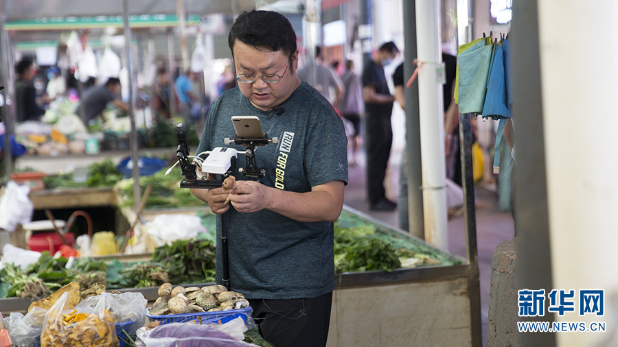 在野生菌交易市场,龚兆荣在进行直播带货(摄于8月2日)。新华网 范芳钰/摄