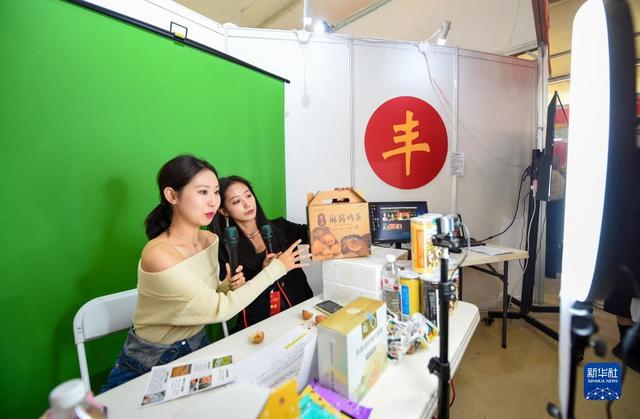 9月19日,一位主播在2022年内蒙古“中国农民丰收节”主会场五谷丰登展览区进行直播。新华社记者彭源/摄