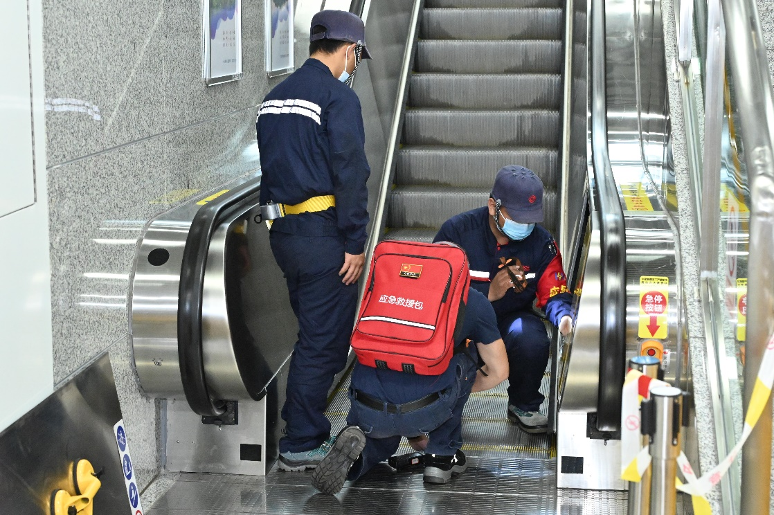 除此以外,本次主题活动还进行了地铁扶梯的应急救援演练。现场模拟了当扶梯出现突发意外,人员摔倒的紧急情况,车站工作人员听到呼救后立即赶到现场安抚乘客,通过对讲机向车控室报告,并通知医护团队和电梯设备维护人员。