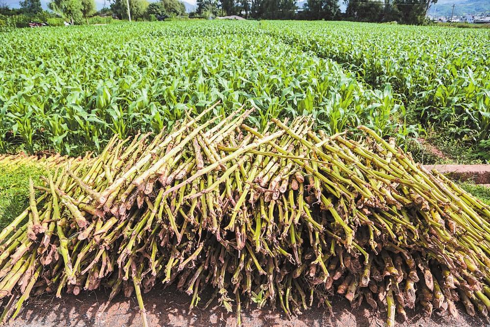 9月,示范区的烟秆清除后堆在路边,田间玉米长势良好。