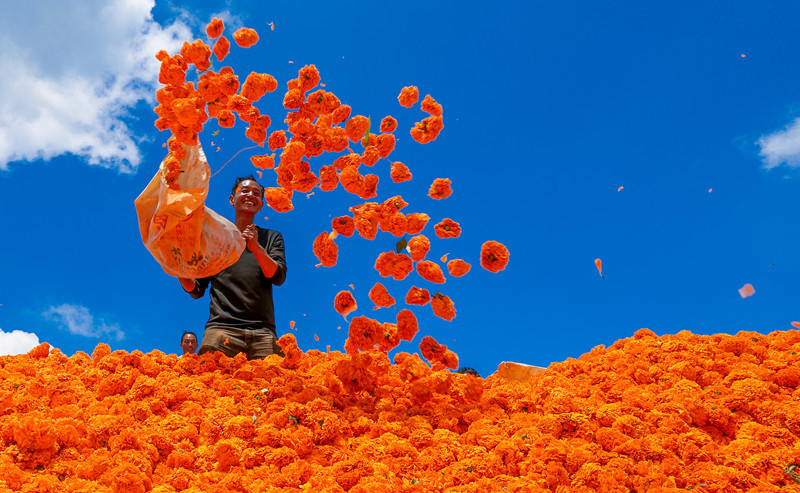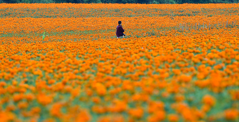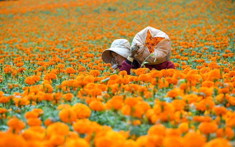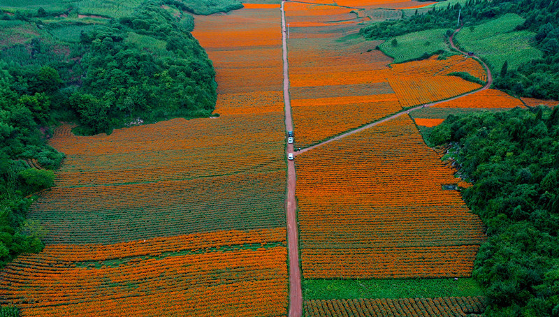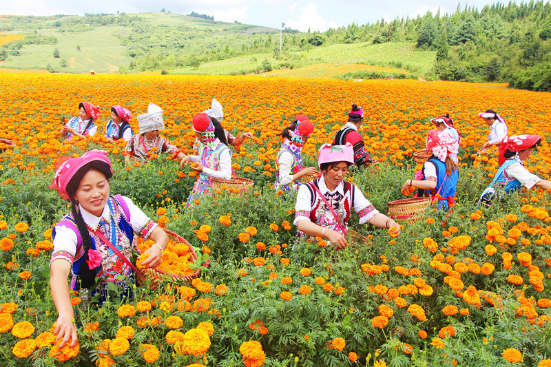 秋收时节,云南省红河哈尼族彝族自治州弥勒市东山镇山涧中万亩连片的万寿菊宛如橙色地毯,成为乡村间一道亮丽的风景线。农户抓住好天气抢采收,一派丰收繁忙景象。近年来,该市在9个乡镇种植万寿菊4.3万多亩,预计今年可实现粗加工产值1.3亿元。
