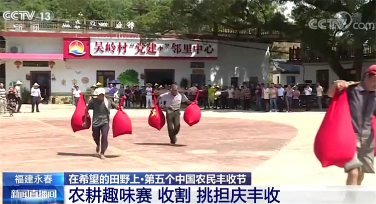 昨天(9月22日),在福建泉州永春县湖洋镇吴岭村,一场农耕趣味赛火热进行。比赛一开始,四组参赛队伍就迅速开割,选手们分工协作、配合默契,现场一片紧张激烈的收割、脱粒的景象。随后,挑担接力赛热闹开始,每支队伍负重100斤,以接力的方式往返进行,大家快速挑担奔跑,现场观众助威声此起彼伏,大家以这样趣味的农耕比赛庆祝丰收。