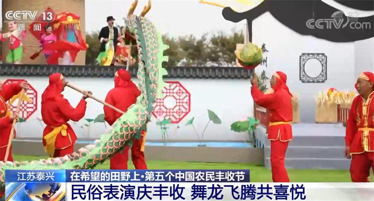 今天,在江苏泰兴市黄桥镇祁巷村的小杂粮基地,江苏多地的民俗表演队在丰收的音乐中载歌载舞,舞龙队则穿梭在人群中飞腾跳跃,传递丰收的喜讯。