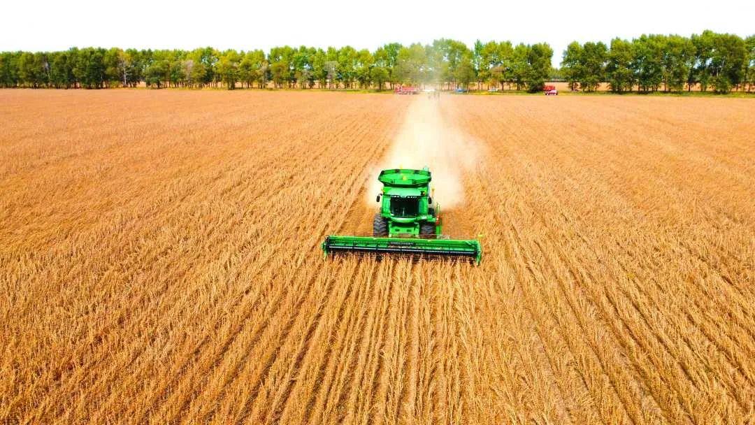 △9月15日,北大荒集团建设农场职工驾驶大型机械抢收丰收的大豆。