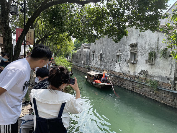 平江路街区水巷泛舟,吸引游客打卡拍照(央广网记者 郑楚豫 摄)