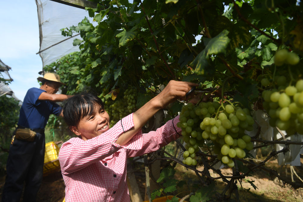 ↑在广西全州县才湾镇毛竹山村,当地村民在收获葡萄(2022年8月23日摄)。