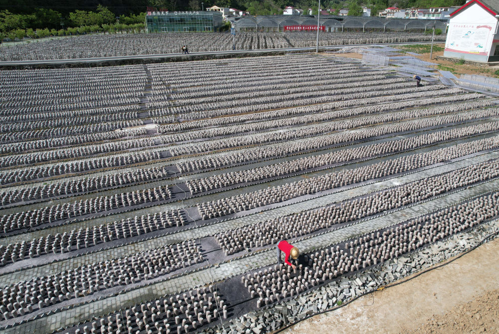 ↑农民在陕西省商洛市柞水县小岭镇金米村查看地栽木耳长势(2022年4月21日摄,无人机照片)。
