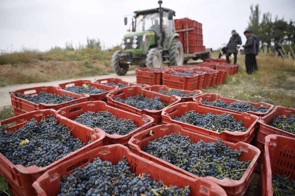 ↑工人在宁夏贺兰山东麓一酒庄葡萄园搬运采摘下的酿酒葡萄(2021年10月14日摄)。