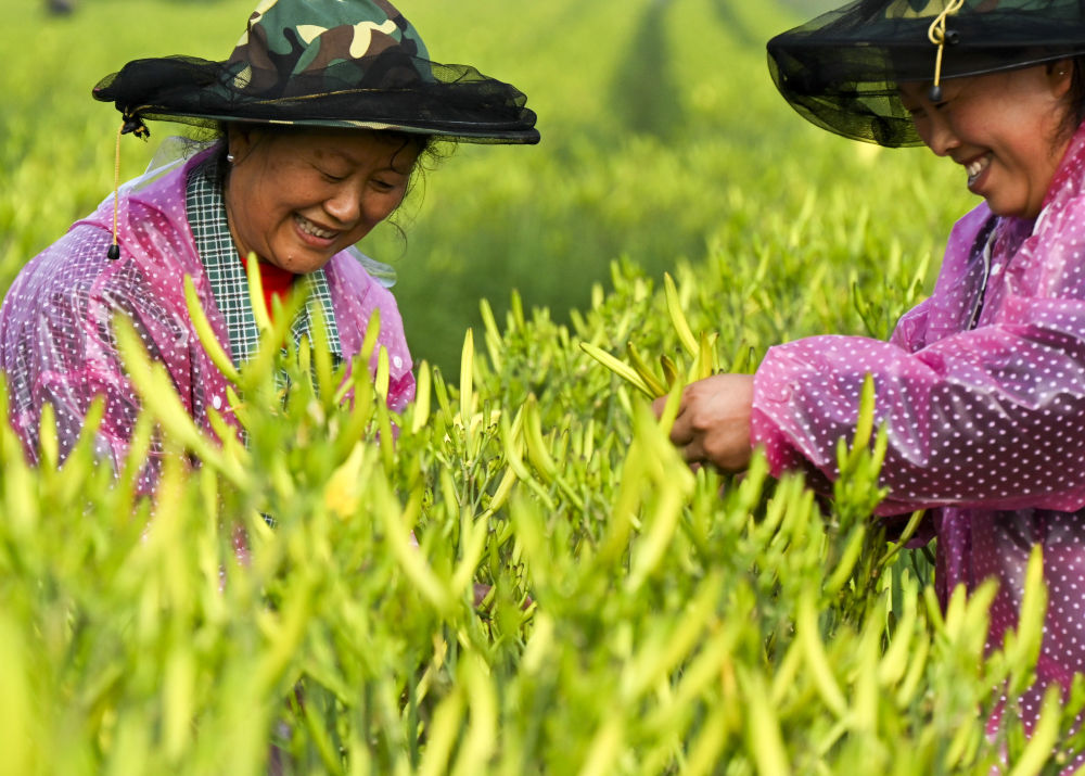 ↑山西省大同市云州区西坪镇贺店村村民在采摘黄花(2021年7月17日摄)。