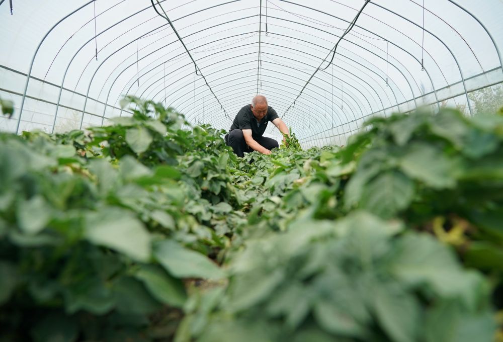 ↑河北省张北县德胜村村民在马铃薯大棚内劳作(2020年8月12日摄)。