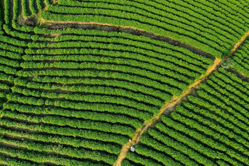 ↑浙江省安吉县黄杜村的白茶茶园(2020年2月25日摄,无人机照片)。