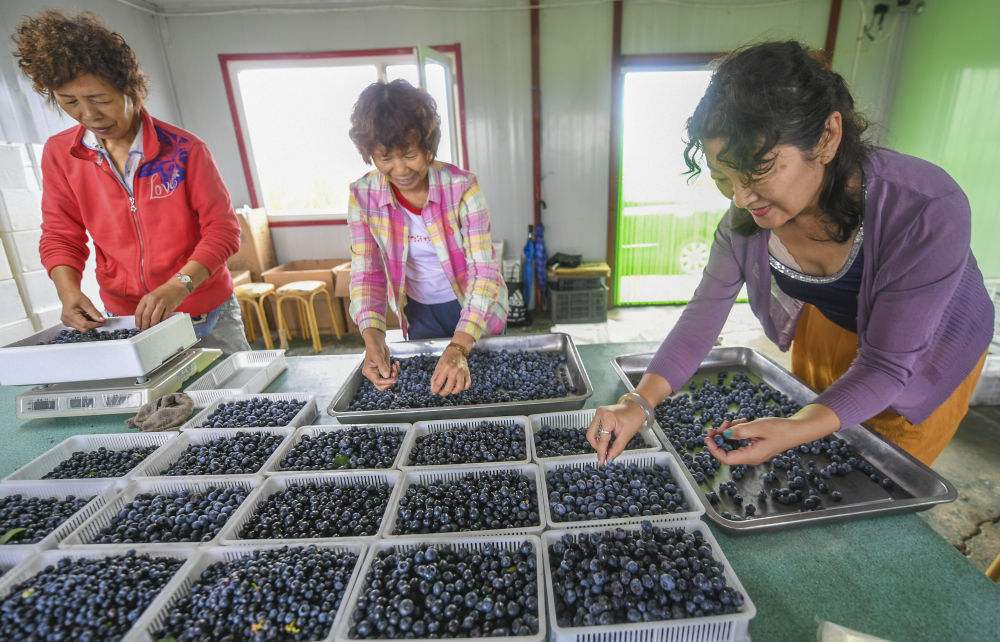 ↑黑龙江省伊春市友好区万亩蓝莓基地采摘园的工人在分拣蓝莓(2019年8月8日摄)。