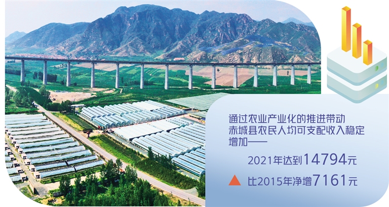 赤城县制定了“2环3带18基地”的发展规划:全力打造环北京自然生态、环冬奥冰雪温泉两大旅游区,在县域重点区域建设白河露天蔬菜、红河设施蔬菜、黑河特色养殖3个生态农业带,在全县18个乡镇建成18个农业示范区。同时,整合涉农资金超过10亿元,实施产业化项目1491个,让全县80%以上的农民嵌入农业产业化进程,农林牧渔业总产值由“十三五”初期的32.38亿元提高到2021年的48.2亿元。