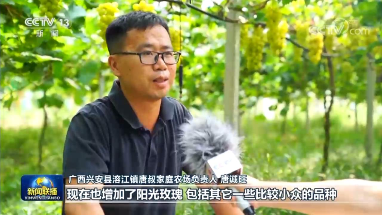 广西兴安县溶江镇唐叔家庭农场负责人 唐诚旺:我们这里是巨峰的老产区,现在也增加了阳光玫瑰,包括一些比较小众的品种,平均亩产应该是2500斤左右。