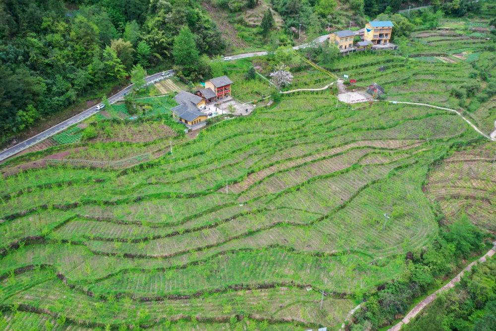 这是重庆石柱土家族自治县中益乡华溪村景观(2022年4月14日摄,无人机照片)。新华社记者 唐奕 摄